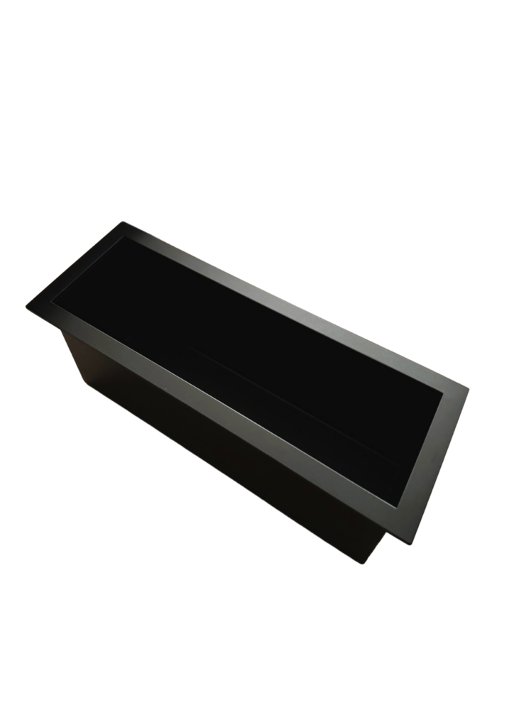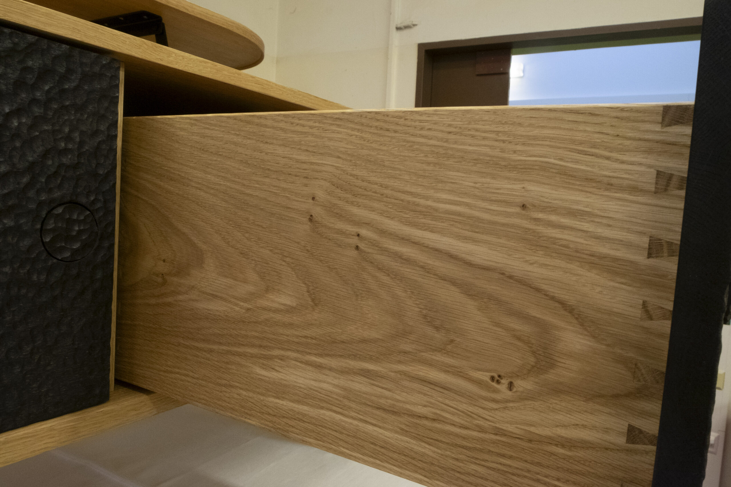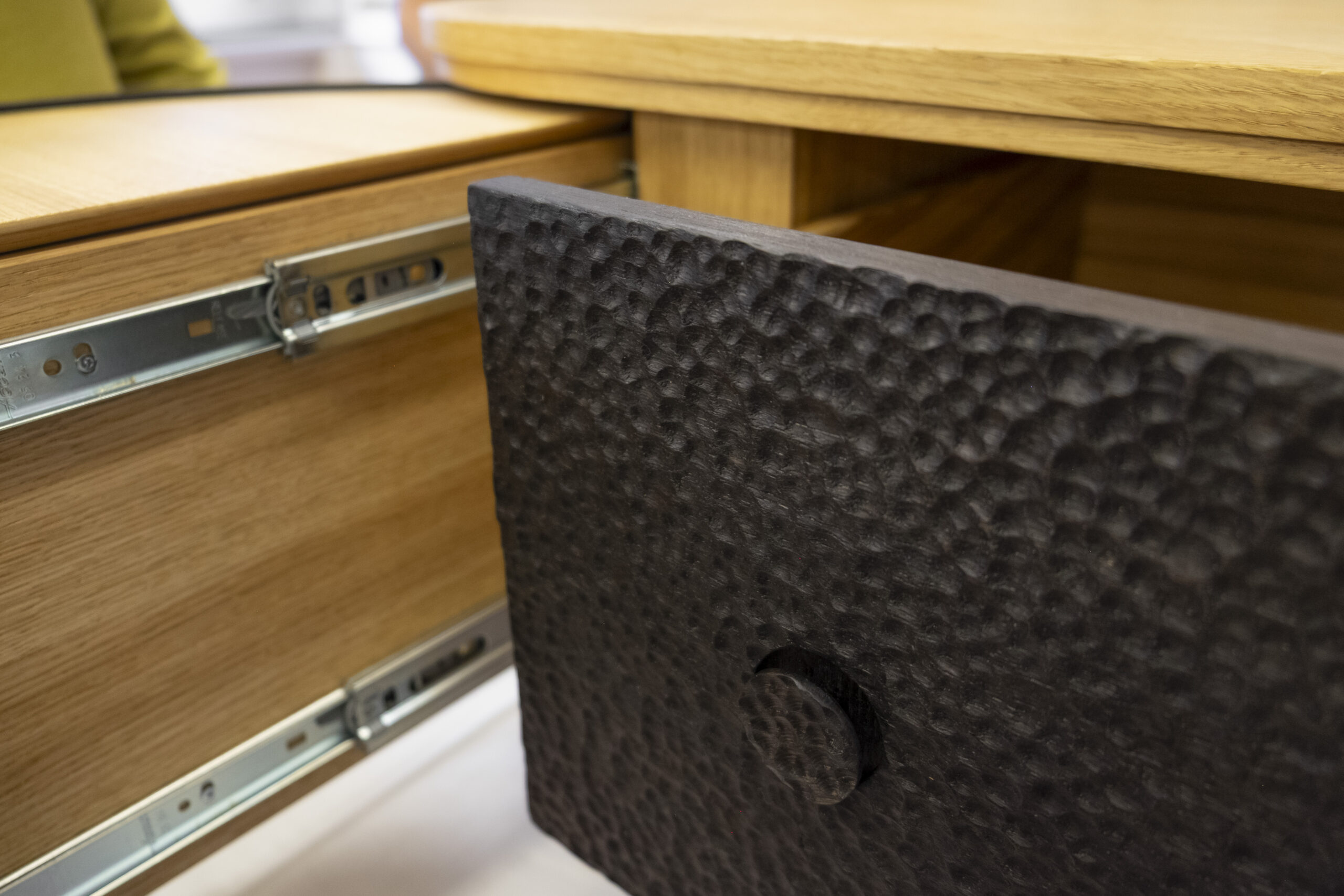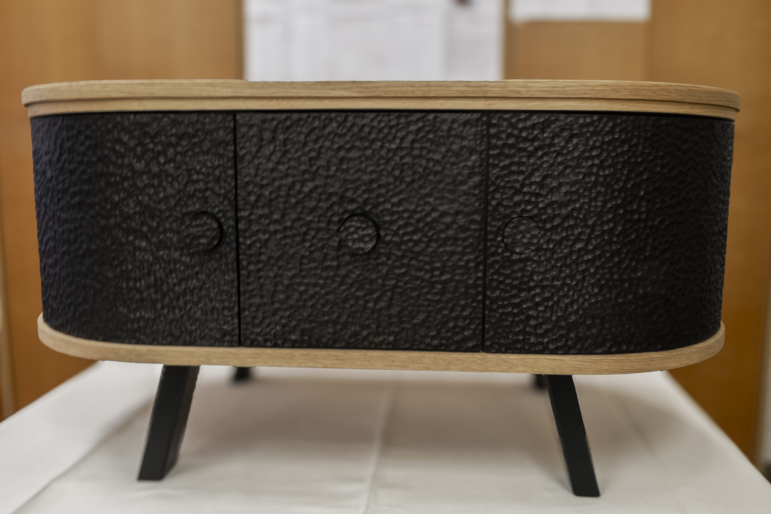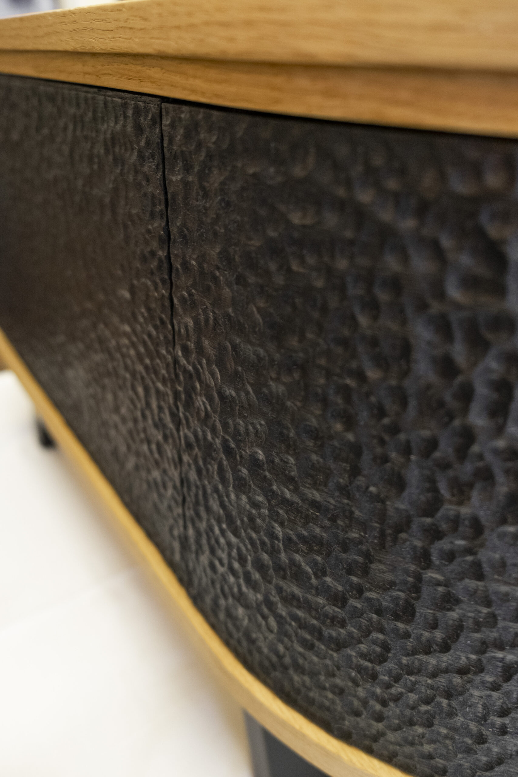 Gefertigt aus massiver Eiche, gebürstet und geölt, verbindet dieses Möbel traditionelle Handwerkskunst mit modernem Design. Die schwarz gebeizten Fronten mit markanter 3D-Struktur setzen einen starken Kontrast zum warmen Holz. Zwei umlaufende Metallstreifen gliedern das Möbel optisch und betonen die klare Linienführung.