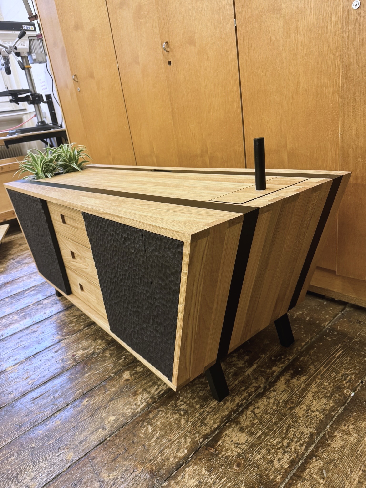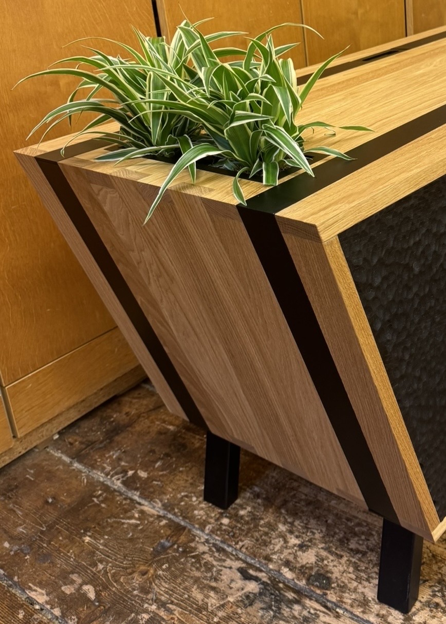 Besonderes Detail sind die eingelassenen Öffnungen in der Oberfläche mit abnehmbaren Abdeckungen durch Magneten für Spezial gefertigte Blumentröge. Die handgezinkten Laden und einem Ladenboden mit Intarsienmuster, zeigen die Liebe zum Detail. Durch die drei unterschiedlichen Winkel im gesamten Möbel, entsteht eine außergewöhnliche, dynamische Formensprache.